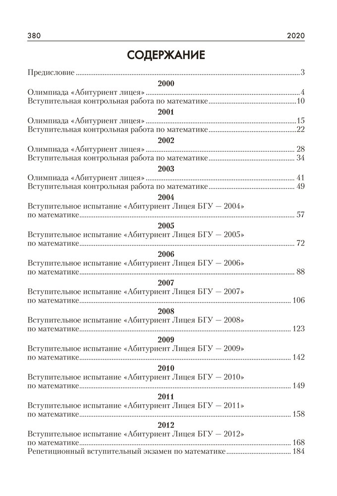 Пособие содержит материалы вступительных экзаменов по математике в Лицей им. Ф. Э. Дзержинского БГУ в 2000—2020 гг. на все специальности, где предусмотрена их сдача, и олимпиад «Абитуриент Лицея БГУ».
