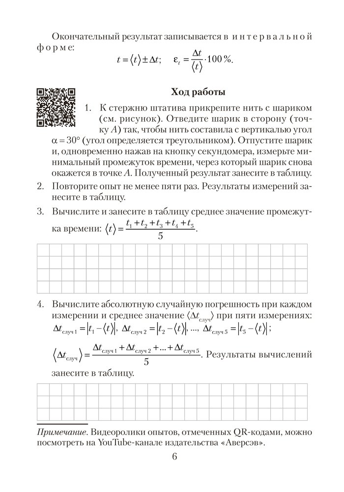 Тетрадь подготовлена в соответствии с учебной программой и является составляющей учебно-методического комплекса по физике для 9 класса. В пособии представлены алгоритмы выполнения лабораторных работ, которые предполагают измерения и вычисления физических величин, умение делать самостоятельные выводы, давать обстоятельные ответы на контрольные вопросы. Использование тетради сокращает и облегчает работу ученика и учителя при оформлении и проверке работ, освобождает время для выполнения творческих заданий. Видеоролики опытов доступны для просмотра на YouTube-канале издательства «Аверсэв». Переход к материалам осуществляется с помощью QR-кодов.
