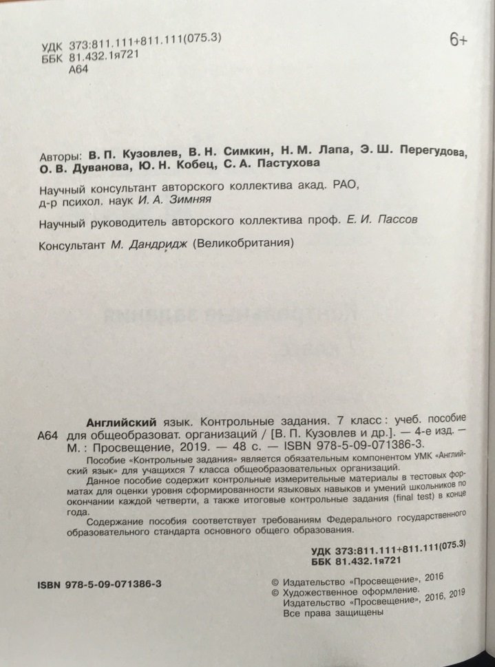 Контрольные задания являются составным компонентом УМК "Английский язык" для учащихся 7 класса общеобразовательных организаций и содержат задания по проведению четвертных и годовых контрольных работ в тестовых форматах по всем видам речевой деятельности, а также рекомендации, которые помогут учащимся лучше справиться с контрольной работой. Каждая из контрольных работ соотносится с материалом циклов уроков в УМК «Английский язык», разработана с учётом изучаемого лексико-грамматического материала в них и построена в соответствии с форматами и требованиями итоговой аттестации для основной общеобразовательной школы.