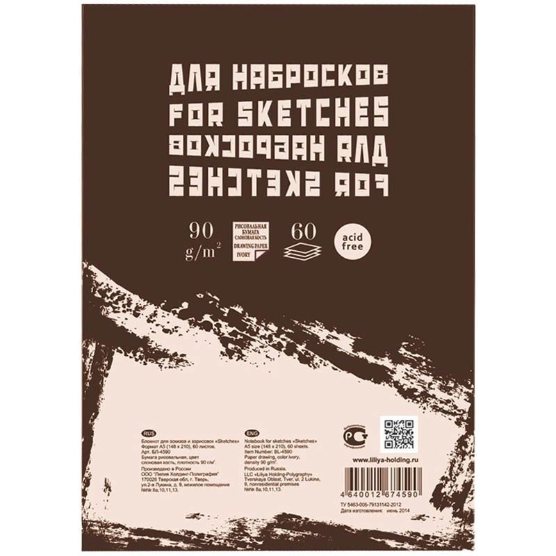 Блокнот для набросков, эскизов, зарисовок в различных видах техники рисования: карандашом, сангиной, соусом, углем, пастелью и тушью. Состоит из рисовальной бумаги цвета слоновой кости, плотностью 90 г/м2, склейка сверху по корешку и имеет основание из жесткого картона для удобства рисования.