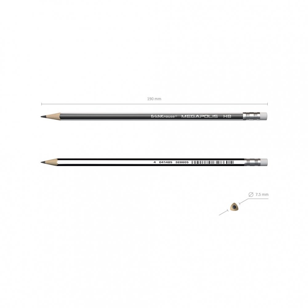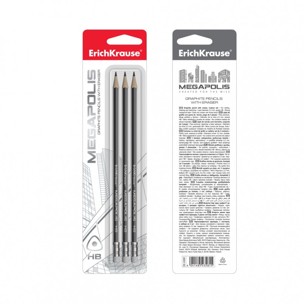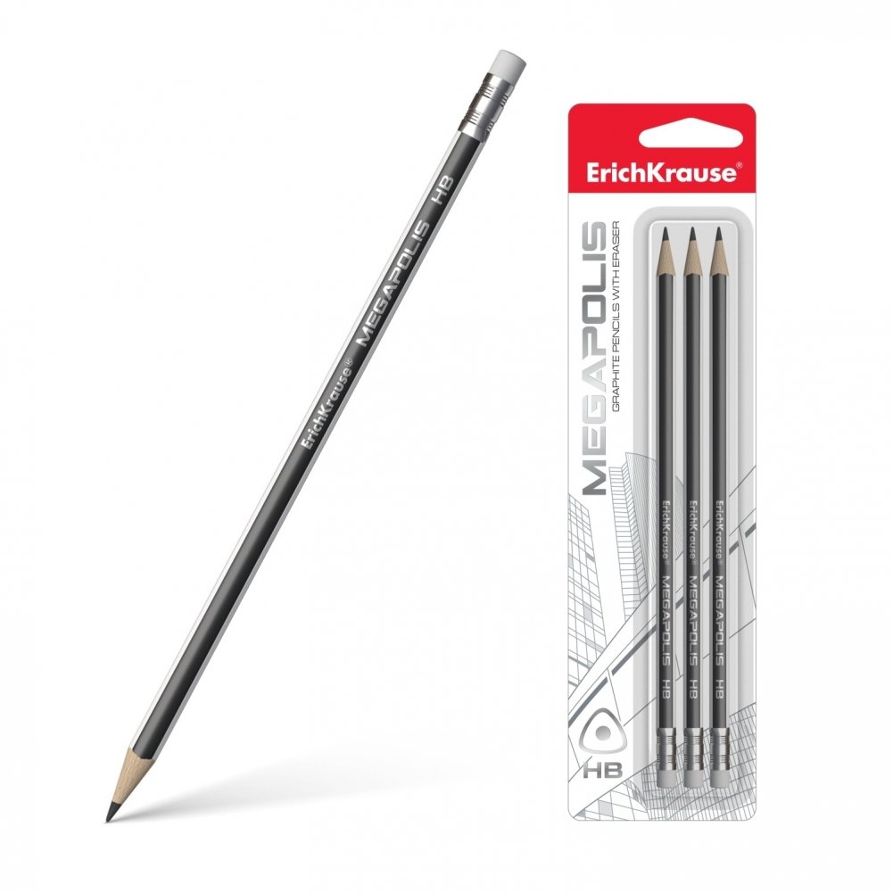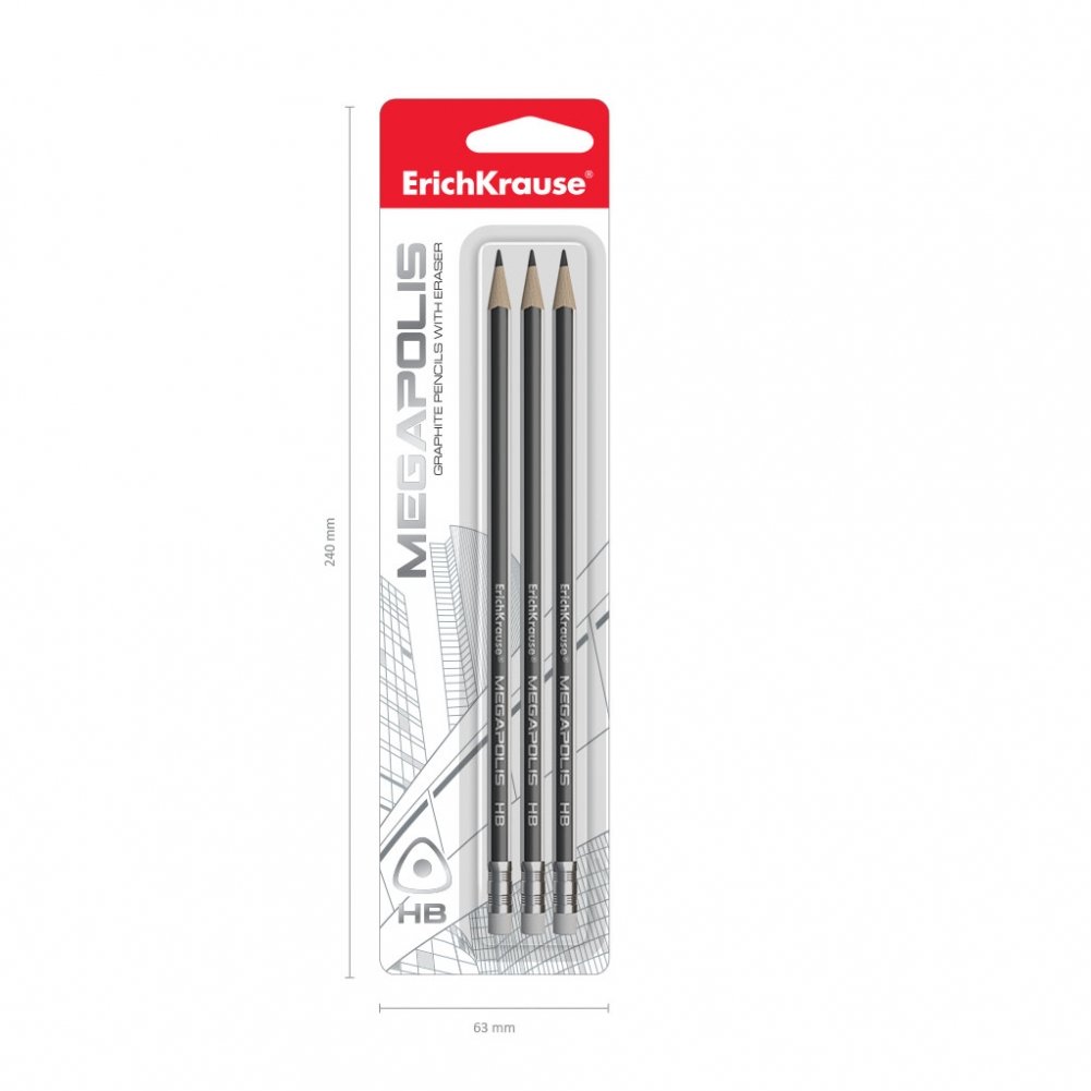 Набор чернографитных трехгранных карандашей с ластиком "MEGAPOLIS", 3 штуки