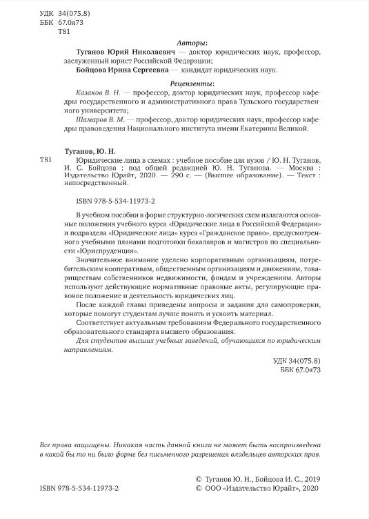 Серия «Университеты России» позволит высшим учебным заведениям нашей страны использовать в образовательном процессе издания (в том числе учебники и учебные пособия по различным дисциплинам), подготовленные преподавателями лучших университетов России и впервые опубликованные в издательствах университетов. Все представленные в этой серии работы прошли экспертную оценку учебно-методического отдела издательства и публикуются в оригинальной редакции. В учебном пособии в форме структурно-логических схем излагаются основные положения учебного курса «Юридические лица в Российской Федерации» и подраздела «Юридические лица» курса «Гражданское право», предусмотренного учебными планами подготовки бакалавров и магистров по специальности «Юриспруденция». Значительное внимание уделено корпоративным организациям, потребительским кооперативам, общественным организациям и движениям, товариществам собственников недвижимости, фондам и учреждениям. Авторы используют действующие нормативные правовые акты, регулирующие правовое положение и деятельность юридических лиц. После каждой главы приведены вопросы и задания для самопроверки, которые помогут студентам лучше понять и усвоить материал. Соответствует актуальным требованиям Федерального государственного образовательного стандарта высшего образования. Для студентов высших учебных заведений, обучающихся по юридическим направлениям.