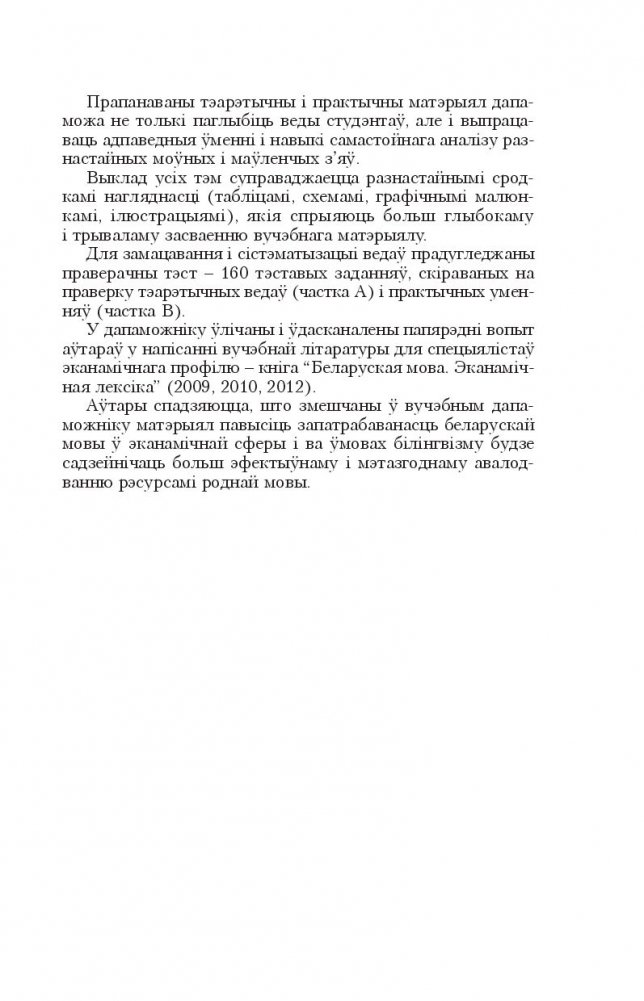 Змяшчае тэарэтычны матэрыял і комплекс практыкаванняў па курсе "Беларуская мова (прафесійная лексіка)" для студэнтаў розных спецыяльнасцей эканамічнага профілю, а таксама тэкставыя заданні і чатыры дадаткі. Асноўная ўвага звернута на прафесійную (спецыяльную) лексіку - асаблівасці вымаўлення, напісання, словаўтварэння, словаўжывання, прыёмы тэрміналагізацыі, уменне адэкватна і мэтазгодна выкарыстоўваць моўныя сродкі ў залежнасці ад камунікатыўнай задачы выказвання. Матэрыялы практыкаванняў маюць эканамічную скіраванасць. Асобна да кожнай тэмы падаюцца творчыя заданні, арыентаваныя на развіццё вуснага і пісьмовага маўлення.