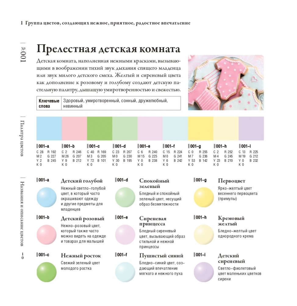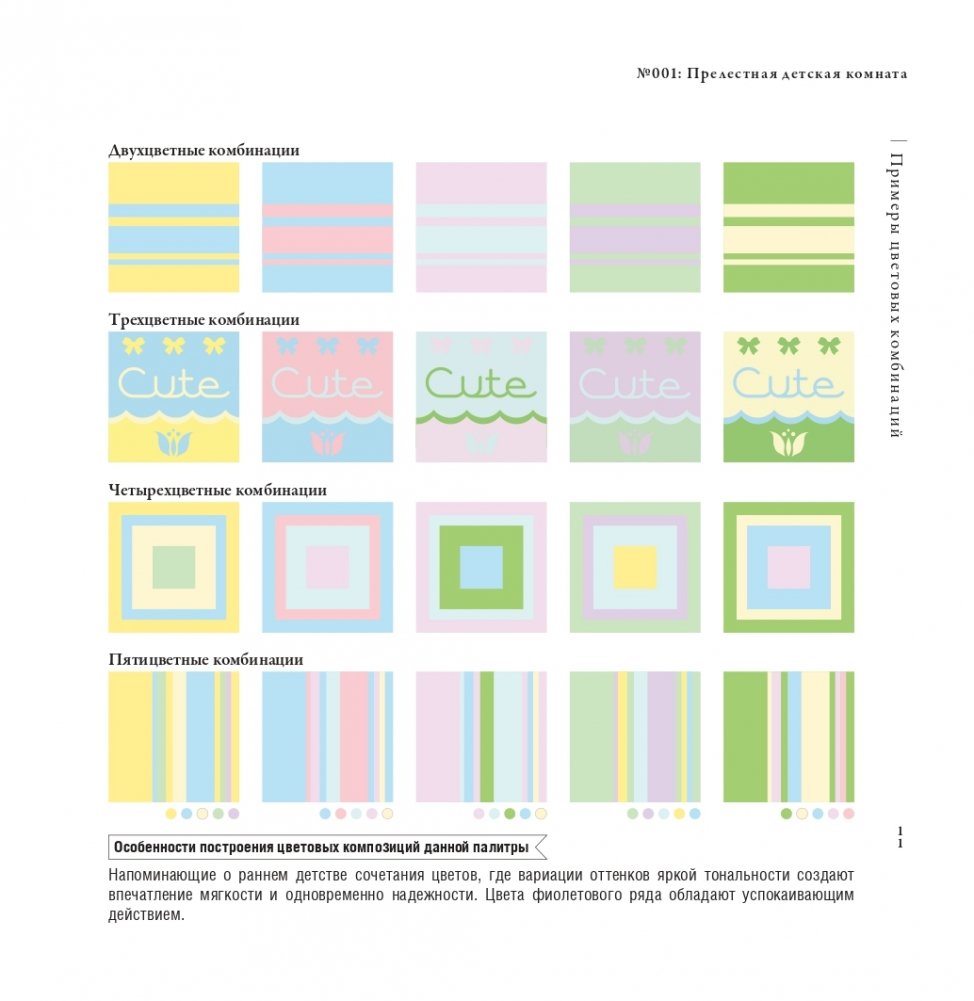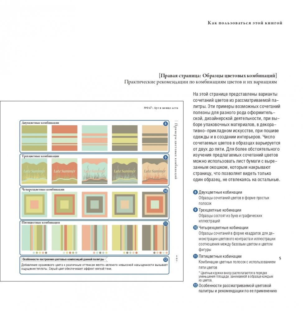 Книга включает описания 125 цветовых палитр, каждая из которых соотносится с определенной темой или категорией. В состав этих палитр входит около 1100 отдельных цветов с указанием их кодов по системам CMYK и RGB. Также вы найдете здесь более 2500 уникальных образцов цветовых комбинаций, полученных путем сочетания цветов из палитры по два, по три, по четыре и по пять. Каждая палитра сопровождается четкими характеристиками составляющих ее цветов и важными замечаниями по их возможным сочетаниям.