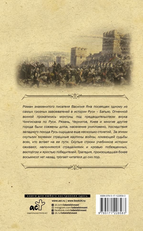 Роман знаменитого писателя Василия Яна посвящен одному из самых грозных завоевателей в истории Руси – Батыю. Огненной волной прокатились монголы под предводительством внука Чингисхана по Руси. Рязань, Чернигов, Киев и многие другие города были сожжены дотла, население уничтожено. Последствия западного похода Рус ощущала еще несколько столетий. За этим скупыми словами страшные картины войны, ломающей судьбы всех, кто встает на ее пути. Строки учебников истории оживают, наполняются страданиями и кровью побежденных, восторгом и яростью победителей. Трагедия, произошедшая более восьмиста лет назад трогает читателя до сих пор.