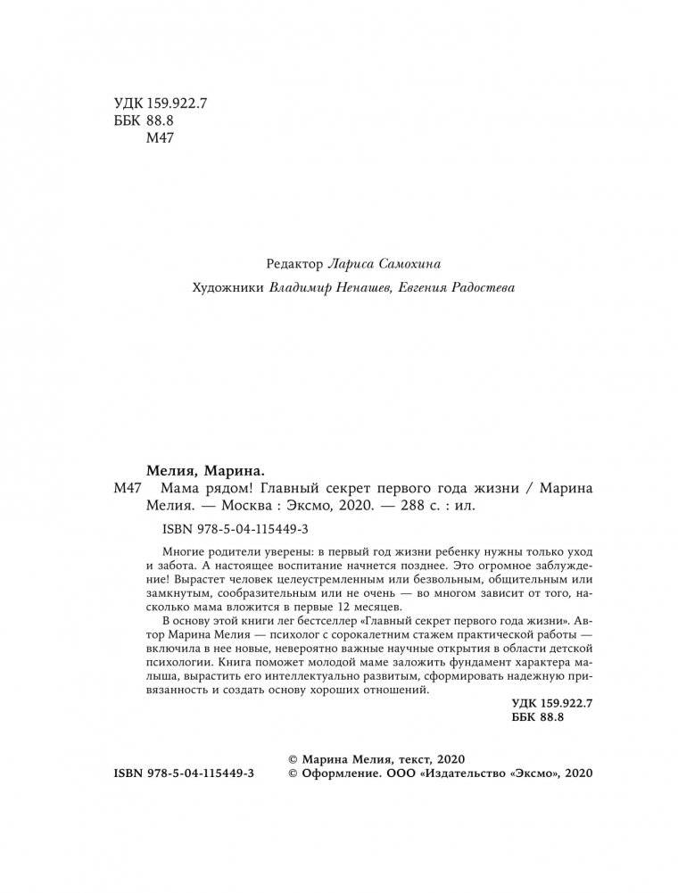 В основу этой книги лег бестселлер "Главный секрет первого года жизни". Автор Марина Мелия — психолог с сорокалетним стажем практической работы — включила в нее новые, невероятно важные научные открытия в области детской психологии. Книга поможет молодой маме заложить фундамент характера малыша, вырастить его интеллектуально развитым, сформировать надежную привязанность и создать основу хороших отношений.