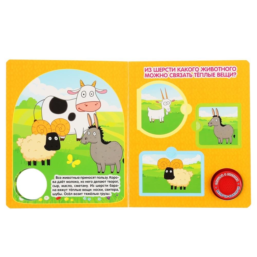 Ребёнок с удовольствием будет листать плотные страницы, рассматривать яркие картинки, открывать окошки и смотреть, кто там спрятался, а также нажимать на кнопку и слушать весёлые песенки. Малыш легко освоит включение звука: по нажатию на кнопку включится первая песенка, при втором нажатии выключится, в 3-ий раз - заиграет следующая песенка и т.д. Благодаря компактному формату книгу удобно взять с собой в дорогу.