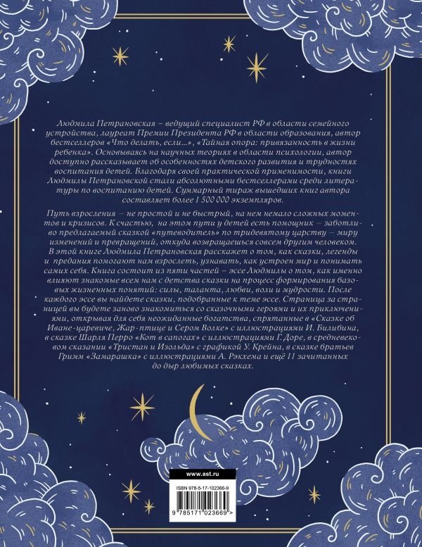 Книга состоит из пяти частей – эссе Людмилы о том, как именно влияют знакомые всем нам с детства сказки на процесс формирования базовых жизненных понятий: силы, таланта, любви, воли и мудрости. После каждого эссе вы найдете сказки, подобранные к теме эссе. Страница за страницей вы будете заново знакомиться со сказочными героями и их приключениями, открывая для себя неожиданные богатства, спрятанные в «Сказке об Иване-царевиче, Жар-птице и Сером Волке» с иллюстрациями И. Билибина, в сказке Шарля Перро «Кот в сапогах» с иллюстрациями Г. Доре, в средневековом сказании «Тристан и Изольда» с графикой У. Крейна, в сказке братьев Гримм «Замарашка» с иллюстрациями А. Рэкхема и ещё 11 зачитанных до дыр любимых сказках.