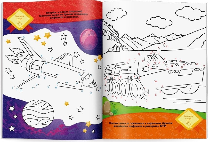 Раскраска с наклейками по точкам, буквам и цветам. Для мальчиков
