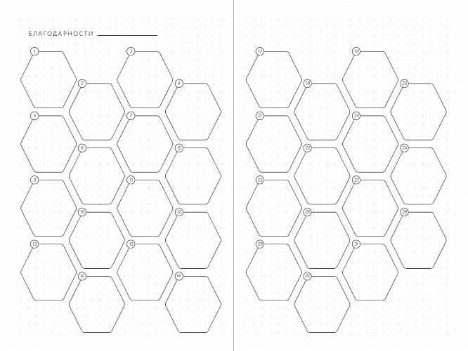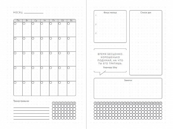 В этом помогут блоки планирования на три месяца, месяц и каждый день, уникальное колесо баланса, трекеры настроения, достижений и благодарности, специальные странички для оценки любимых книг и фильмов и вдохновляющие цитаты.