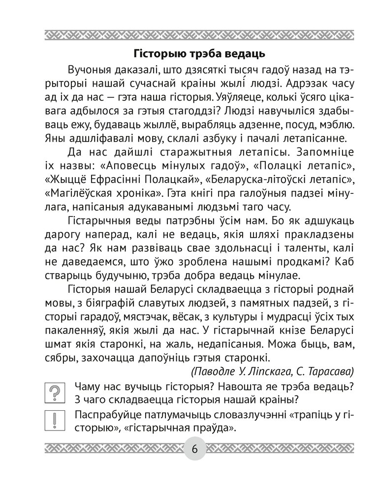 Кніга адпавядае вучэбнай праграме для 4 класа і ўключае тэксты для сумеснага чытання дзяцей і дарослых. Матэрыял дапаможніка носіць развіццёвы характар і будзе спрыяць атрыманню цікавых звестак пра гістарычную спадчыну нашай краіны.