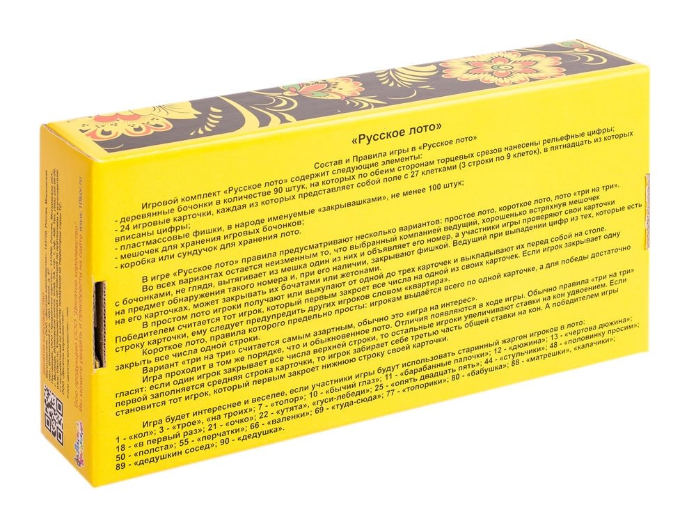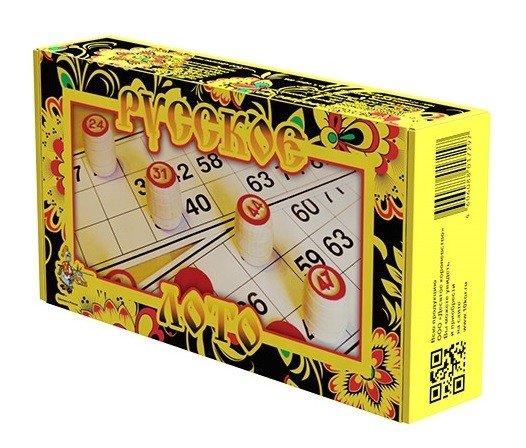 Настольная игра "Русское лото" включает в себя 24 карточки, разделенные на клетки. Специальные пронумерованные бочонки, выполненные из дерева, нужно перемешать в мешке и, вытаскивая не глядя, собрать на своем поле указанные числа.