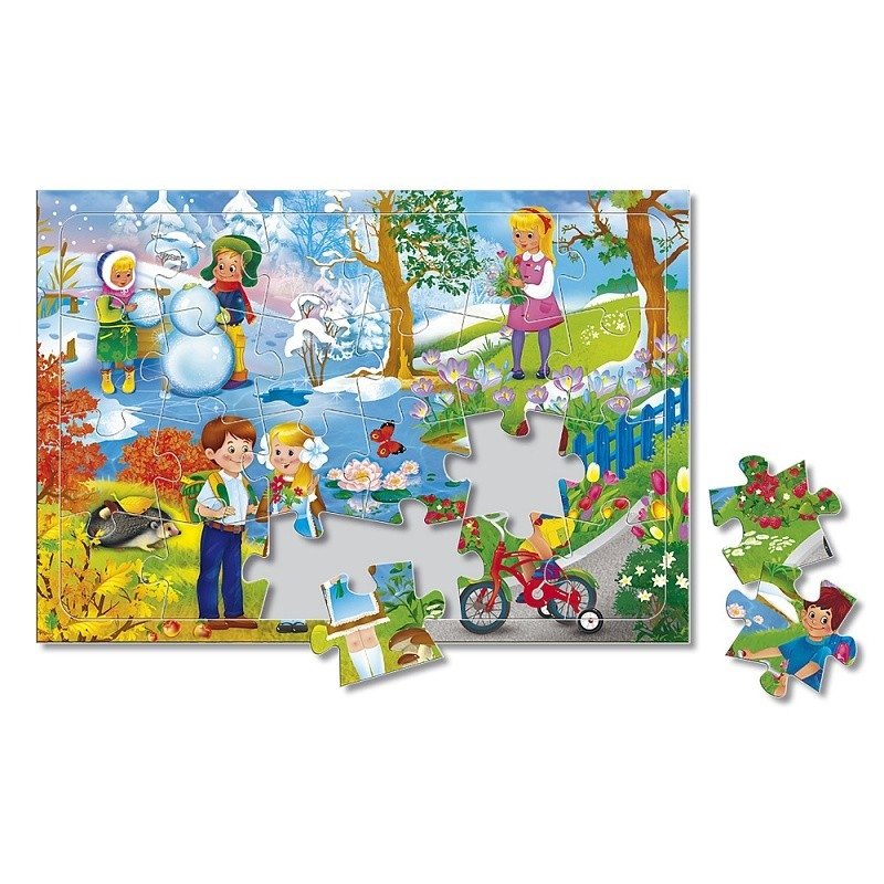 Пазл ГеоДом "Времена года" непременно понравится вашему ребенку. Собрав этот пазл, включающий в себя 24 картонных элемента, вы получите замечательную картину, на которой запечатлены все времена года. Пазл собирается на специальной картонной подложке. Элементы пазла достаточно крупные и идеально подойдут для самых маленьких.