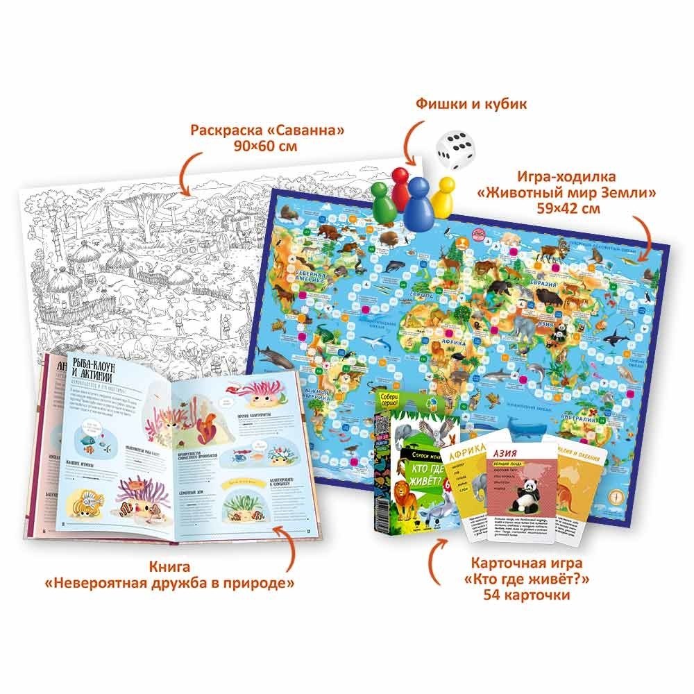 Подарок для самых умных "Животные мира" (книга + большая раскраска + игра-ходилка + карточная игра)