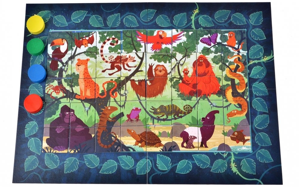 Вперёд, в джунгли! Над тропическими лесами восходит солнце и раскрашивает его обитателей яркими красками. В ходе игры в "Прятки в джунглях" вам предстоит раскладывать карточки в определённом порядке, как детали мозаики – и собирать из них разнообразных ярких обитателей джунглей, таких как тукан, горилла или лемур. Но выкладывать карточки нужно строго по правилам, держа их в уме – а значит, в ходе игры маленькие игроки будут развивать свою память. Собрав животное целиком, вы сможете передвинуть свою фишку на какое-либо количество клеток вперёд, и тот, кто продвинется дальше всех – побеждает. Правилами предусмотрено несколько уровней сложности, так что интересно играть будет не только самым маленьким, но и более старшим и опытным настольщикам.