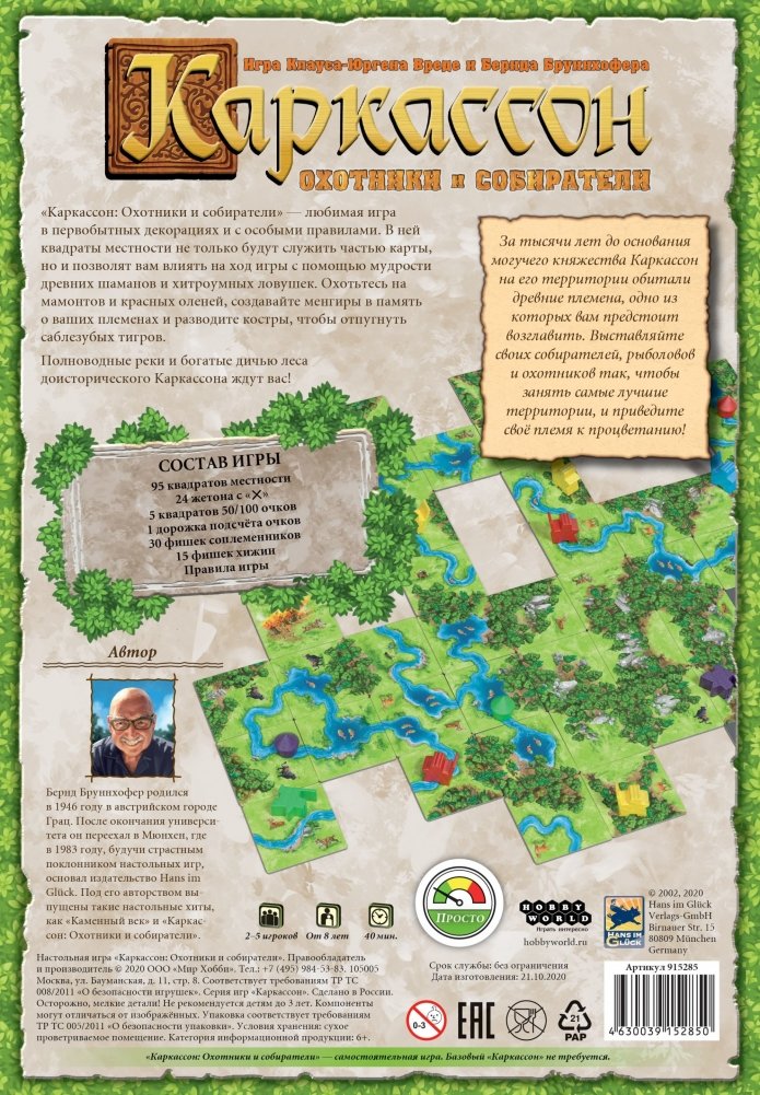 "Каркассон" – замечательная настольная игра для 2-5 человек с удивительным геймплеем, за которым все игроки буквально выстраивают яркую и милую карту местности. Это одна из самых известных игр в мире, которую любят игроки всех возрастов. Игра обладает множеством наград и высокими оценками. В чём секрет успеха? "Каркассон" отличается оригинальной механикой на выставление тайлов, красочностью, простотой правил и глубиной игрового процесса, милым дизайном, тематикой строительства своего королевства, узнаваемыми подданными и многим другим... В этой серии игр вышло множество различных вариантов и дополнений. Сегодня мы познакомимся с "Охотниками и собирателями"!