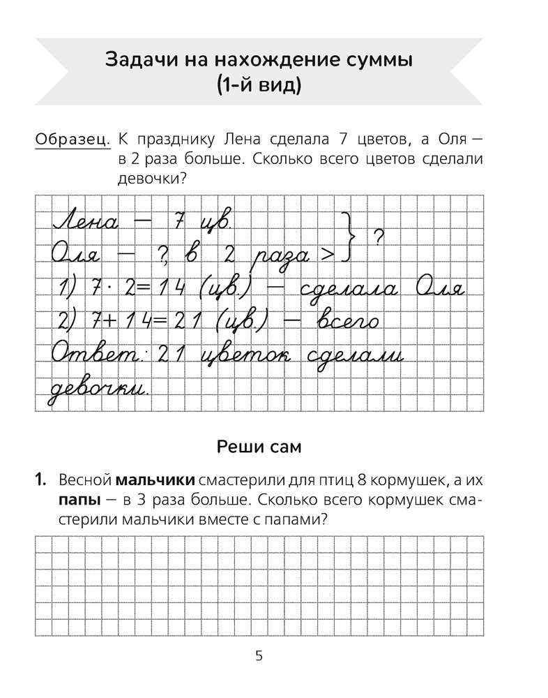 В тетради содержатся основные виды составных задач для 3 класса, предусмотренные учебной программой. Материалы пособия включают алгоритм решения, образцы выполнения, задачи для самостоятельной работы, закрепления, а также контроля знаний. Издание поможет третьеклассникам научиться уверенно и быстро решать составные задачи.