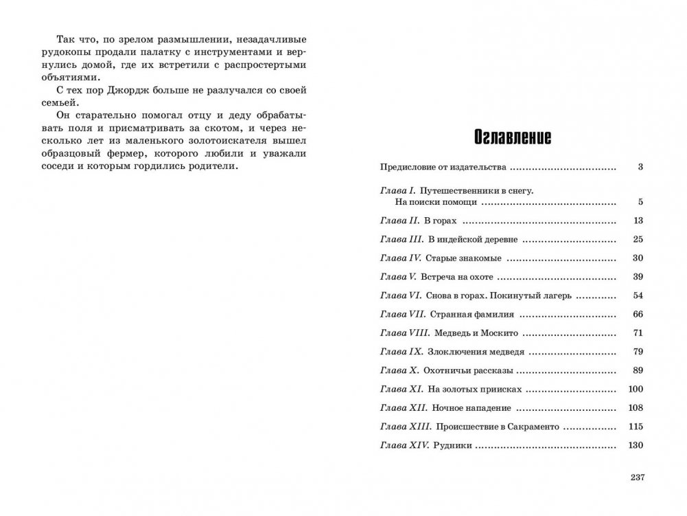 Калифорния, 1849 год, «золотая лихорадка» – на таком фоне развиваются события повести. Семья переселенцев терпит бедствие в горах, и четырнадцатилетний мальчик отправляется на поиски помощи, оставив отца, мать и маленькую сестренку в снегах Сьерра-Невада. Но снова встретиться со своими близкими ему предстоит еще очень нескоро. Отважный мальчик переживает множество опасных, захватывающих, а порой и забавных приключений. И на всем пути его сопровождает случайно встреченный в лесу загадочный старый охотник…
