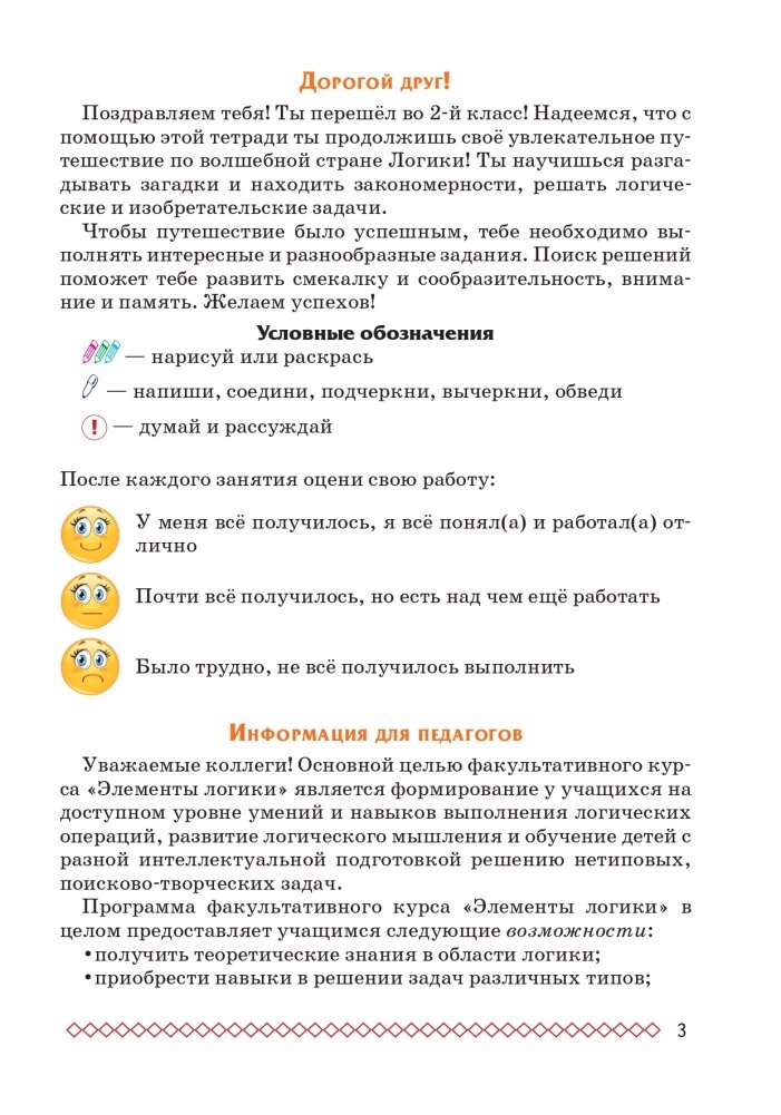 Пособие содержит материалы для проведения 34 занятий на протяжении учебного года (1 час в неделю) в соответствии с программой факультативных занятий "Элементы логики" во 2-м классе. Предлагаемые задания помогут развить логическое мышление, наблюдательность и смекалку, внимание и память.