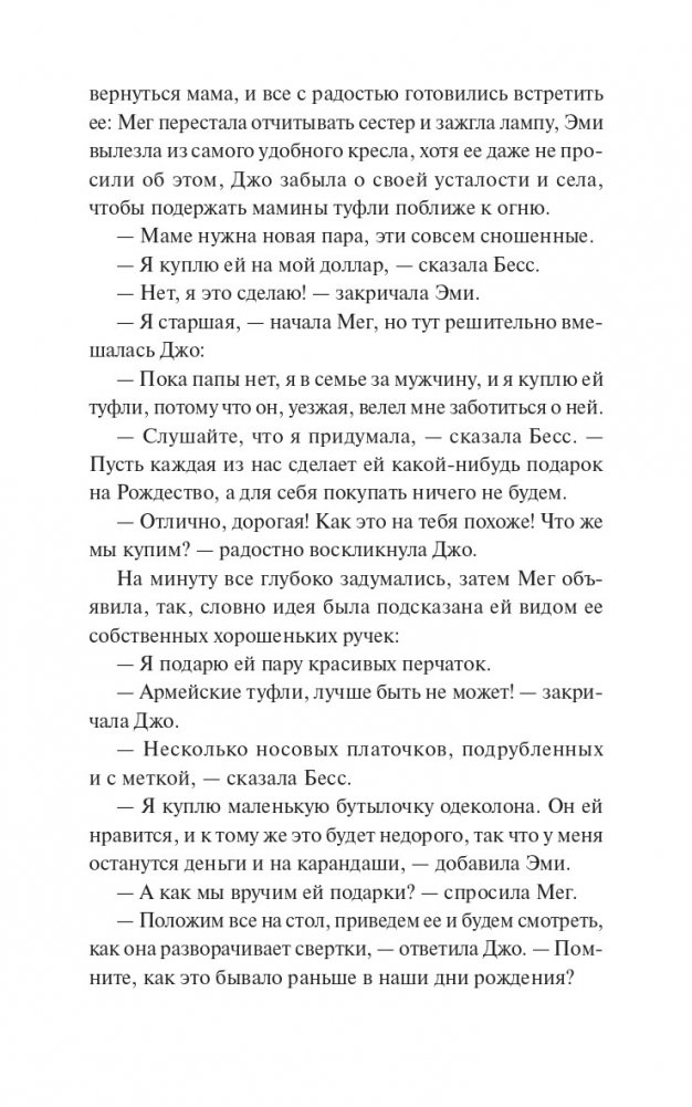"Маленькие женщины" — ставший классическим роман американской писательницы Луизы Мэй Олкотт о четырех сестрах Марч, которые вместе переживают нелегкие времена. Обратившись к воспоминаниям детства, писательница, выросшая в дружной, но небогатой семье, показывает читателю жизнь таких разных и все же близких друг другу девушек — Мег, Джо, Бесс и Эми. Каждая из них идет своим путем, но и в радостях, и в ссорах не забывает о том, что по-настоящему важно: о семье, любви и дружбе. "Как было бы здорово, если бы все воздушные замки, которые мы строим в мечтах, могли стать настоящими и в них можно было бы жить". Для кого эта книга: Для читателей классической литературы. Для тех, кому нравятся светлые и добрые истории. Для читателей, которые хотят иметь в своей библиотеке классические книги с красивыми обложками и качественной бумагой.