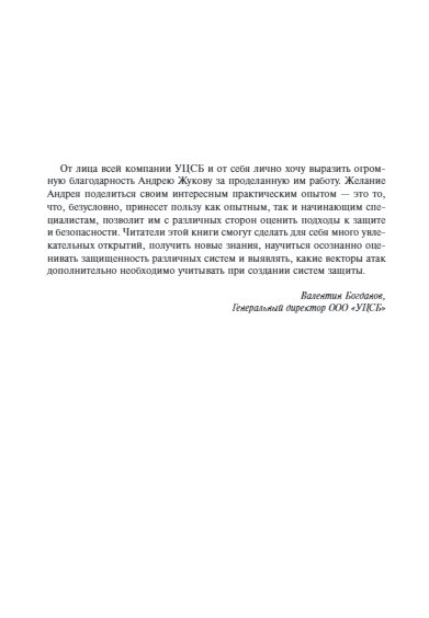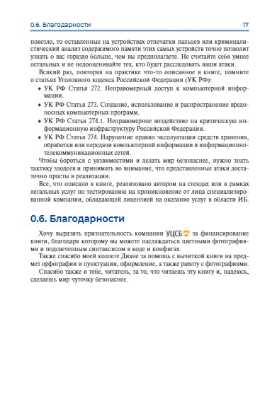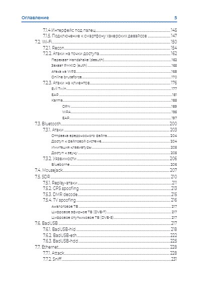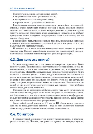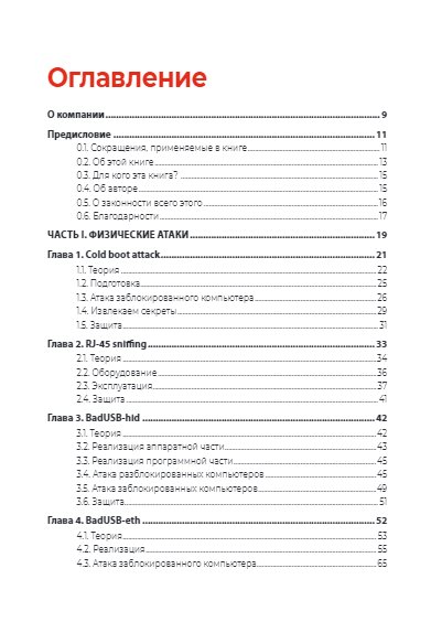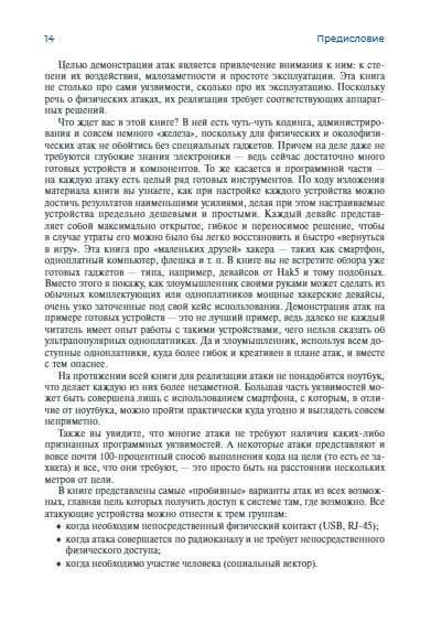 Книга посвящена физическим атакам на беспроводные сети и компьютеры с использованием самодельных хакерских устройств и защите от них. Показан способ дампа памяти компьютера при помощи обычной флешки, метод перехвата сетевого трафика посредством зажимов-«крокодилов». Подробно освещены различные атаки BadUSB, продемонстрирован метод организации несанкционированного доступа к компьютеру при помощи 4G-модема и подключения к локальной сети через хакерское устройство на базе одноплатного компьютера. Описаны атаки на беспроводные сети и уличные IP-камеры с помощью самодельного устройства Wi-Fi Pineapple. Продемонстрирован способ атаки на сеть и устройства с использованием дрона, оборудованного одноплатным компьютером. Описана конструкция защищенного от помех квадрокоптера с управлением по мобильной сотовой сети. Рассказано о том, как превратить обычный мобильный телефон в «трекер» или хакерское устройство, позволяющее управлять гаражными воротами или шлагбаумами.