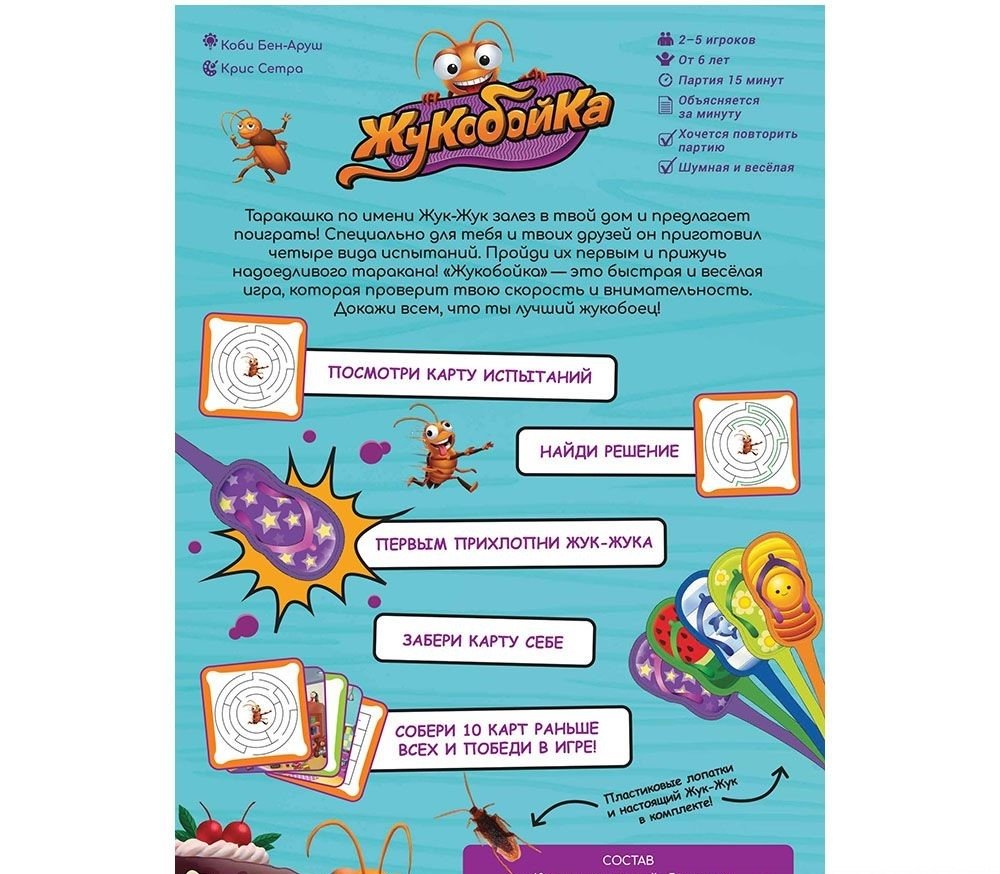 Для начала раздайте каждому игроку по лопатке – она вам понадобится, чтобы бить по пронырливому таракану в ходе игры! Перемешайте и положите колоду, а рядом с ней разместите самого Жук-Жука таким образом, чтобы всем было удобно до него дотянуться. Готовы? Можно начинать игру!