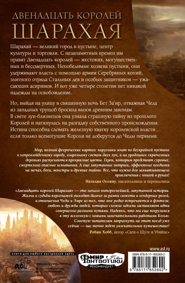 Шарахай — великий город в пустыне, центр культуры и торговли. С незапамятных времен им правят Двенадцать королей — жестоких, могущественных и бессмертных. Непобедимые хозяева пустыни, они удерживают власть с помощью армии Серебряных копий, элитного отряда Стальных дев и особых защитников — ужасающих асиримов. И вот уже четыре столетия нет никакой надежды на освобождение.