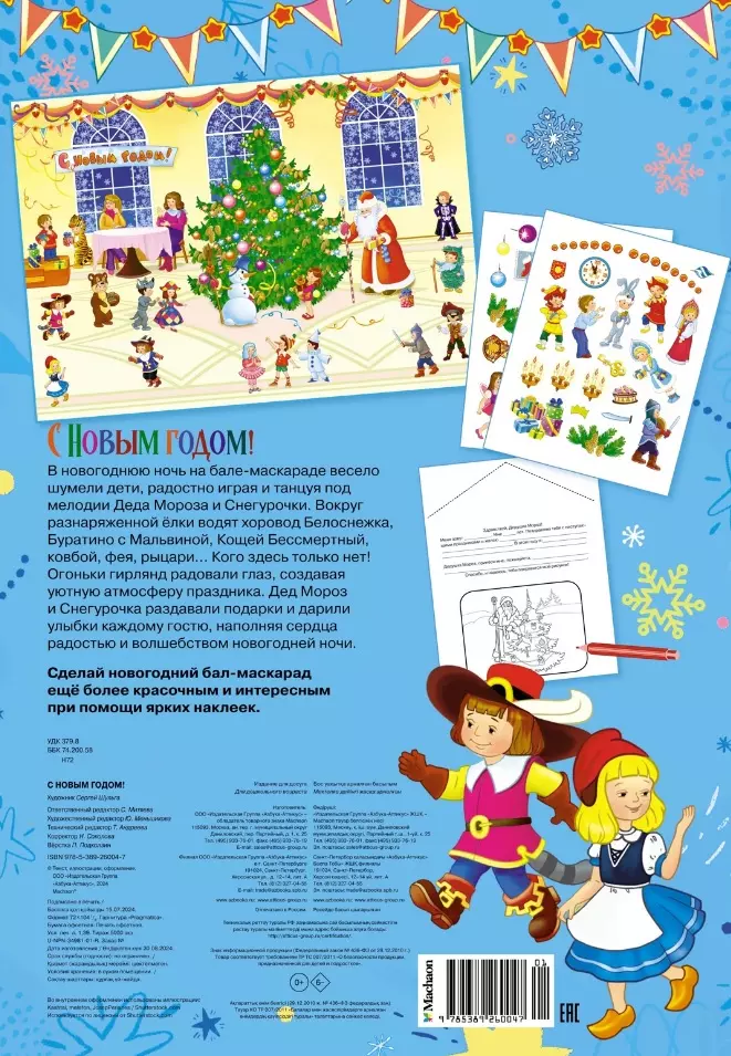 В новогоднюю ночь на бале-маскараде весело шумели дети, радостно играя и танцуя под мелодии Деда Мороза и Снегурочки. Вокруг разнаряженной ёлки водят хоровод Белоснежка, Буратино с Мальвиной, Кощей Бессмертный, ковбой, фея, рыцари… Кого здесь только нет! Огоньки гирлянд радовали глаз, создавая уютную атмосферу праздника. Дед Мороз и Снегурочка раздавали подарки и дарили улыбки каждому гостю, наполняя сердца радостью и волшебством новогодней ночи. Сделай новогодний бал-маскарад ещё более красочным и интересным при помощи ярких наклеек.