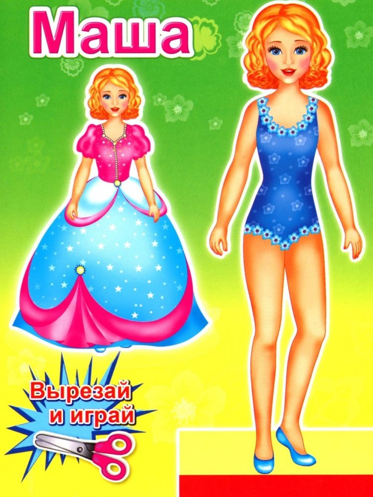 Вырежи куклу с подставкой с первой и последней страницы обложки и склей её. Вырежи наряды и играй с куклой.