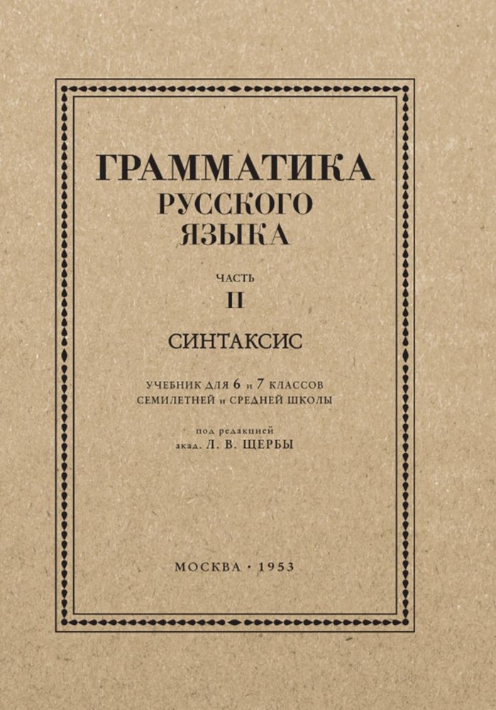 Данная книга представляет собой переиздание второй части учебника под редакцией проф. Л.В. Щербы по грамматике русского языка для 6 и 7 классов средней школы (1953 год), которая посвящена синтаксису. В учебнике два больших раздела: синтаксис простого предложения и синтаксис сложного предложения. Первый раздел даёт представление о главных и второстепенных членах предложения, о строе простого предложения, об однородных и обособленных членах предложения, о словах, грамматически не связанных с предложением. Второй раздел знакомит учащихся с особенностями сложносочинённого, сложноподчинённого, бессоюзного предложения и сложного предложения с разными видами связи, а также даёт понятие о прямой и косвенной речи. Со структурой предложения тесно связаны особенности пунктуации, поэтому автор уделяет много внимания постановке знаков препинания в конструкциях разных типов. Язык учебника прост и доступен для учеников любого уровня, что делает его универсальным помощником в изучении синтаксиса.