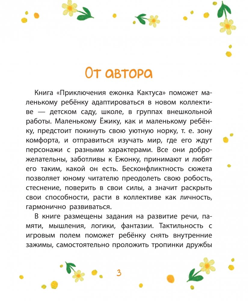 Сказка рассказывает о приключениях маленького ёжика, который изучает мир и заводит новых друзей. Встречая различных животных, он учится дружбе, взаимовыручке и смелости. В книге размещены задания на развитие речи, памяти, мышления, логики, фантазии.