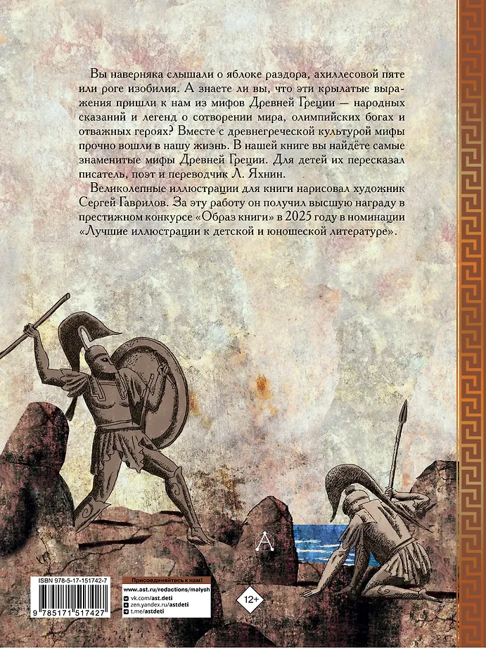 В книге собраны самые знаменитые мифы Древней Греции в пересказе Л. Яхнина — известного писателя, поэта и переводчика. В сборнике вы найдёте мифы о сотворении мира, о знаменитых богах и богинях, а также об отважных подвигах древнегреческих героев, которые не боялись бросить вызов самим "олимпийцам". Неповторимые, запоминающиеся иллюстрации нарисовал художник-постановщик анимационного кино и иллюстратор книг Сергей Гаврилов. За свою работу он получил высшую награду на конкурсе "Образ книги-2025" в номинации "Лучшие иллюстрации к детской и юношеской литературе".