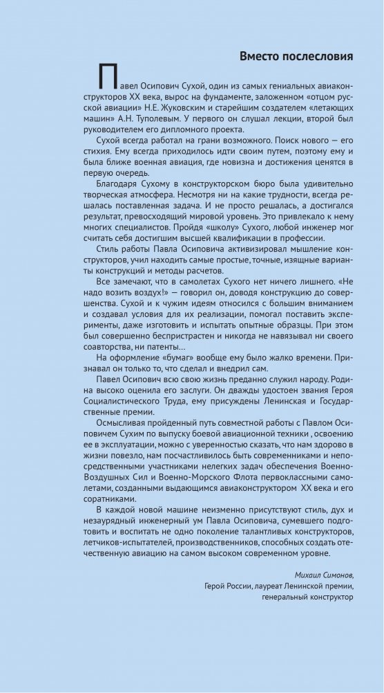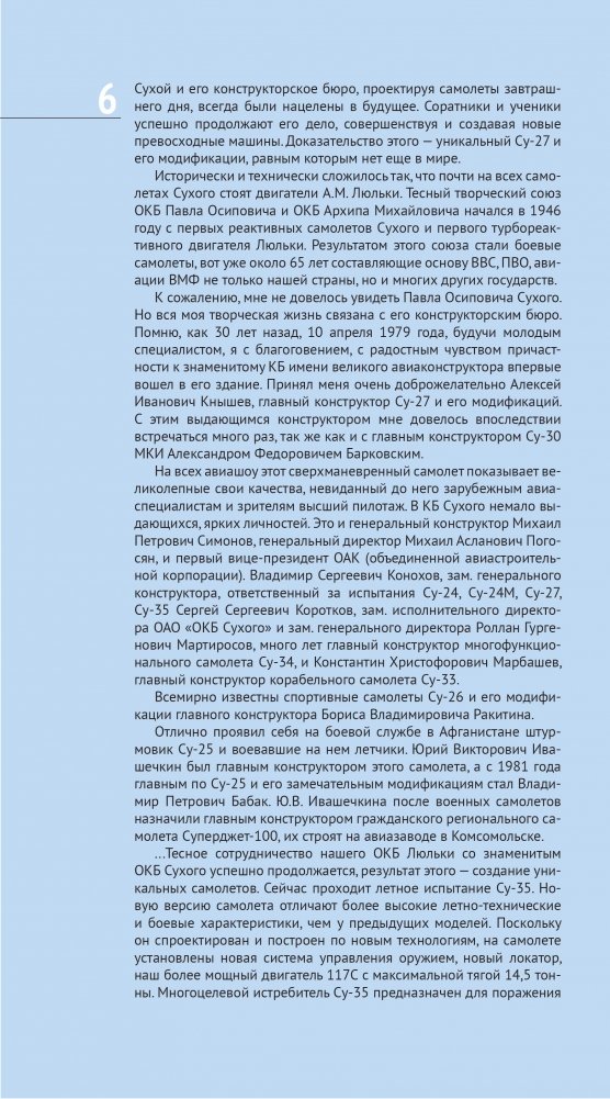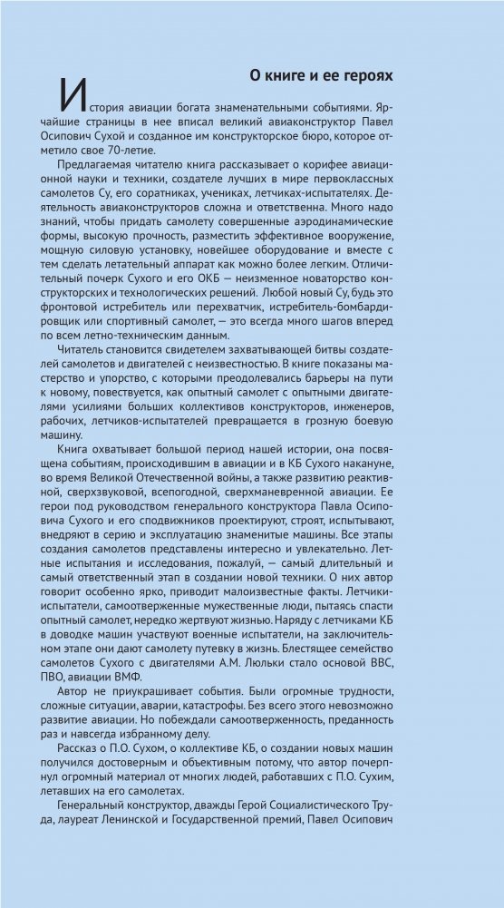 Книга посвящена нашему земляку, выдающемуся авиаконструктору, дважды Герою Социалистического Труда, лауреату Ленинской и Государственных премий Павлу Осиповичу Сухому. Созданное им более 70 лет назад конструкторское бюро и сегодня является лидером мирового авиастроения. Именно Сухой спроектировал первый истребитель- бомбардировщик с изменяемой в полете стреловидностью крыла, именно он первым вышел на скорости, вдвое превышающие скорость звука.