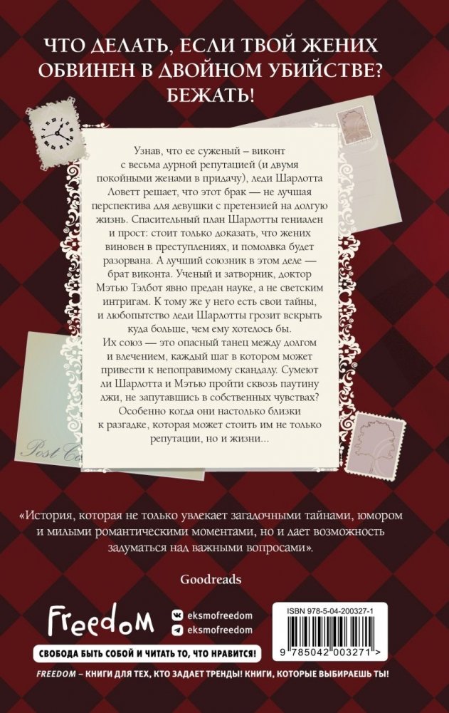 Помолвка с потенциальным убийцей? Нет, увольте! Чтобы не стать третьей женой в «коллекции» виконта Хоули, леди Шарлотта готова на все. План девушки безупречен: найти доказательства вины жениха при помощи его же брата — умного, скрытного и чертовски привлекательного доктора Мэтью Тэлбота. У Мэтью есть свои секреты, и он совсем не рад появлению любопытной леди. Застенчивый ученый согласен помочь, но при одном условии: Шарлотта должна держать свой любопытный носик подальше от его тайн. Теперь, чтобы раскрыть правду, эти двое рискуют всем, но не знают, что самая большая опасность — это их внезапно вспыхнувшие чувства.