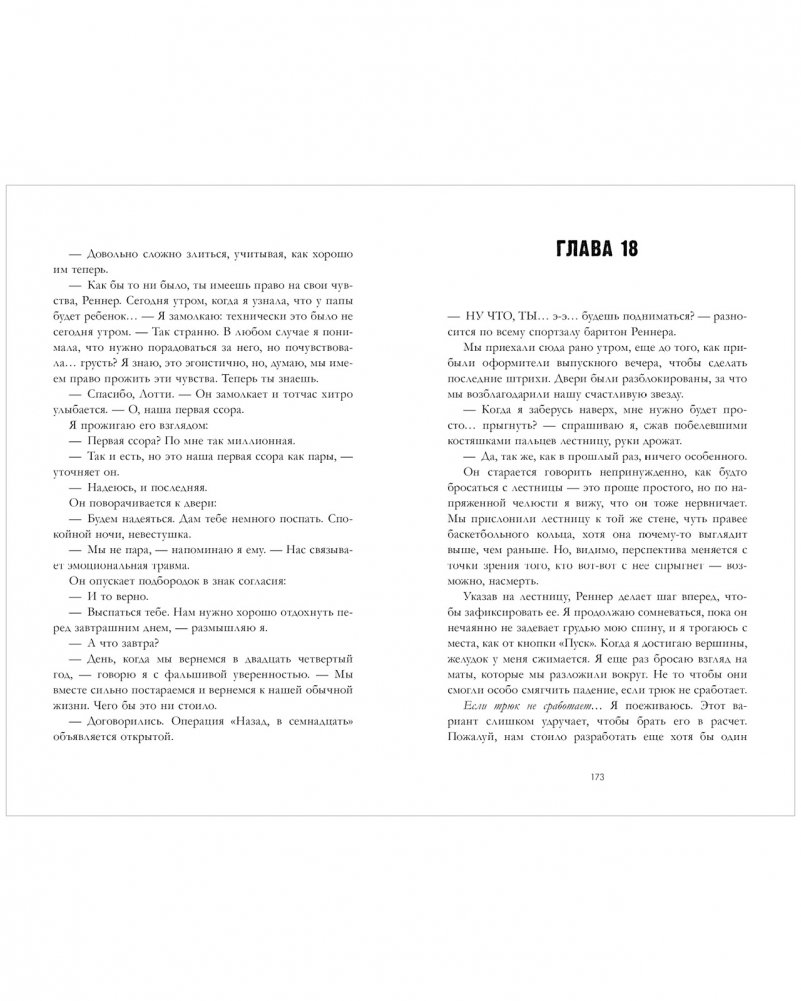 «Быть главой комитета по организации выпускного — то, что я планировала с девятого класса. Упасть с лестницы, потерять сознание и перенестись во времени — последнее, что могло со мной случиться. Каким‑то образом я перескочила тринадцать лет своей жизни и очнулась тридцатилетней. К тому же помолвленной со своим заклятым школьным врагом Джей-Ти Реннером.