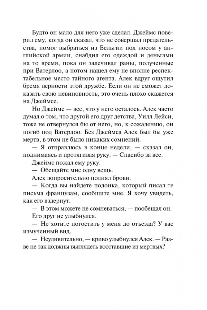 Когда-то Александр Хейз был блестящим офицером, героем, человеком чести, а теперь, ни в чем не повинный, ославлен предателем. Чтобы восстановить свое доброе имя, он вынужден стать тайным агентом короля. Семья считает Александра давно погибшим. Бывшие друзья отвернулись. И единственная, кто может помочь ему выполнить опасное задание, — Крессида Тернер, которая не доверяет предателю, но вынуждена с ним сотрудничать. Однако очень скоро Крессида влюбляется в Алека, и эта любовь может подарить им счастье — или стоить жизни…