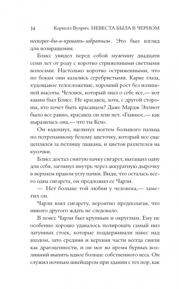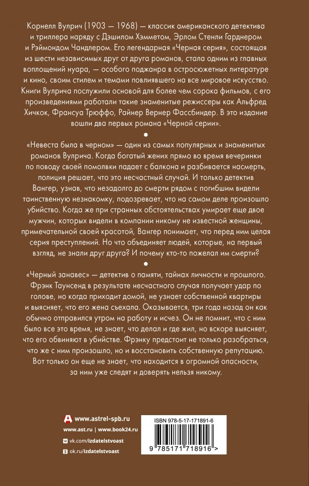 "Невеста была в черном" — один из самых популярных и знаменитых романов Вулрича. Когда богатый жених прямо во время вечеринки по поводу своей помолвки падает с балкона и разбивается насмерть, полиция решает, что это несчастный случай. И только детектив Вангер, узнав, что незадолго до смерти рядом с погибшим видели таинственную незнакомку, подозревает, что на самом деле произошло убийство. Когда же при странных обстоятельствах умирает еще двое мужчин, которых видели в компании никому не известной женщины, примечательной своей красотой, Вангер понимает, что перед ним целая серия преступлений. Но что объединяет людей, которые на первый взгляд не знали друг друга? И почему кто-то пожелал им смерти?