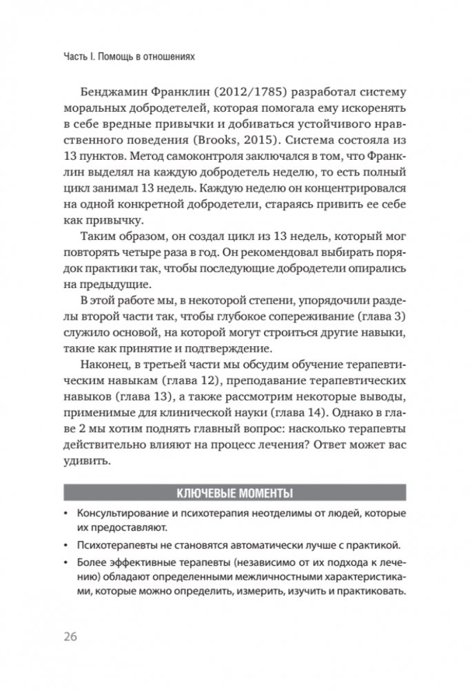 Почему некоторые психотерапевты более эффективны, чем другие? А результаты их клиентов более впечатляющи? Наша книга дает ответ на эти вопросы, рассказывая о навыках общения и установках психотерапевта, которые часто упускаются из виду во время клинической подготовки. Анализируя исследования, посвященные психотерапии, проведенные в течение последних 70 лет, авторы выделили восемь главных качеств терапевта, которые улучшают результаты клиентов, независимо от используемого подхода. Если вы практикующий психотерапевт или собираетесь им стать, все необходимые рекомендации по изучению, отработке и использованию важнейших клинических навыков вы найдете в этом издании.