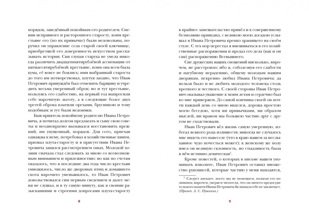 Всё творчество А. С. Пушкина, великого русского поэта и писателя, — подлинный образец безупречного слога и литературного вкуса. Обращение Пушкина к прозе было обдуманным шагом, которому предшествовали размышления о природе словесного искусства. В творчестве первого русского поэта отразилась вся Россия: её история, традиции, верования, мощь национального характера и человеческие страдания… «Повести Белкина» — это прежде всего истории о любви и о верности слову, о благородстве и о стойкости, которые приходится проявлять обыкновенным людям, сражаясь с изменчивой судьбой за своё счастье.