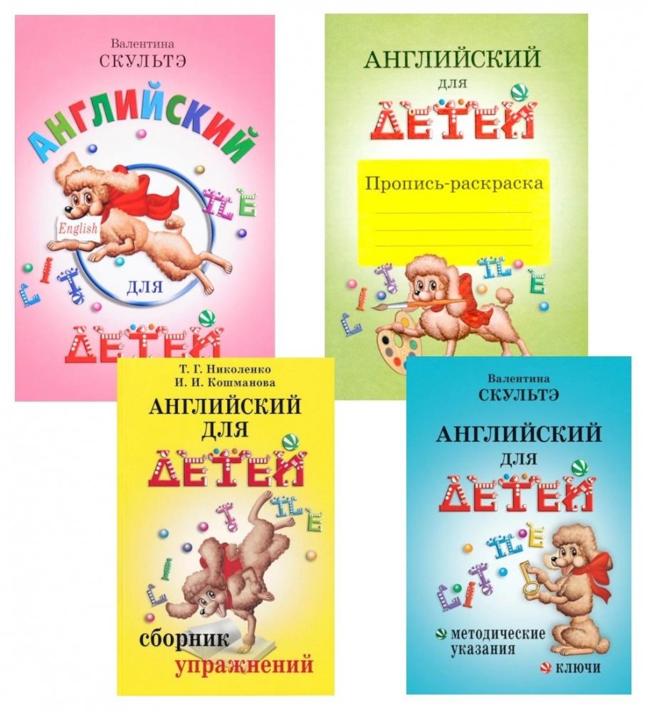 Комплект из четырёх учебных пособий — надёжная основа для увлекательного и эффективного изучения английского языка детьми от 6 лет. В него входят цветной учебник «Английский для детей» В. Скультэ, пособие «Методические указания и ключи» того же автора, пропись-раскраска и «Сборник упражнений» И. Кошмановой и Т. Николенко.
