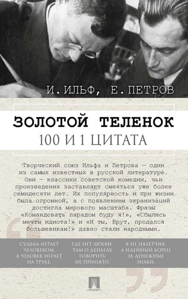 «Золотой телёнок» — второй роман Ильфа и Петрова, посвящённый приключениям Остапа Бендера. В нём мы снова возвращаемся к уже знакомому и любимому читателями герою и отправляемся с ним в новую авантюру. В этой книге мы собрали цитаты персонажей, ставшие для большинства афоризмами. Мы старались не только вспомнить самые известные их фразы и высказывания, но и передать с их помощью уникальную атмосферу большого приключения, пронизывающую каждую строчку великого произведения.