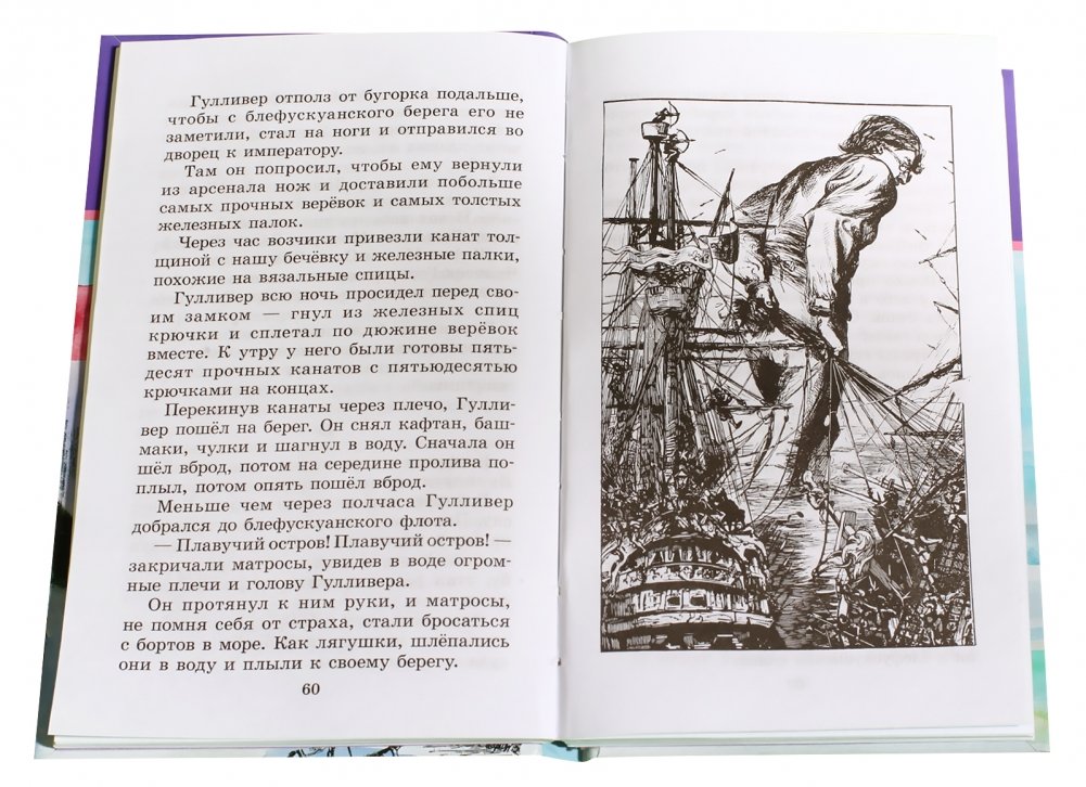 Пересказ Т. Габбе для детей необычайных приключений Лемюэля Гулливера в фантастической стране Лилипутии и в удивительной стране великанов — Бробдингнег.