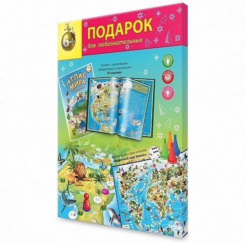 Новогодний подарок для любознательных. Животный мир Земли. Атлас с наклейками+игра-ходилка