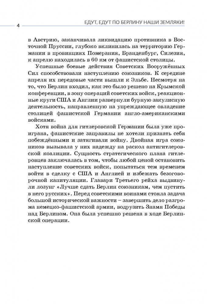 На страницах издания автор рассказывает, как в ходе Берлинской стратегической операции проявили себя белорусы, сражаясь плечом к плечу с бойцами Красной Армии многонационального Советского Союза и воинами зарубежных стран против немецко-фашистских захватчиков. На основе биографических сведений наших земляков воссоздана картина последней битвы Великой Отечественной войны.