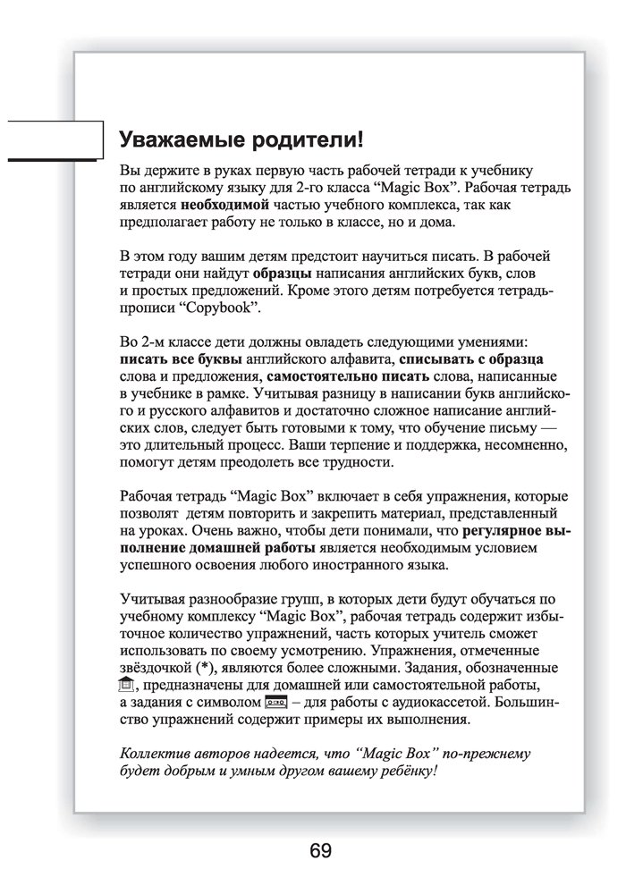 Рабочая тетрадь-1 является составной частью учебно-методического комплекса «Волшебная шкатулка» для 2 класса, в который также входят книга для ученика, рабочая тетрадь-2, прописи-1, прописи-2, книга для чтения, книга для учителя, набор тематических карточек и аудиоприложение.