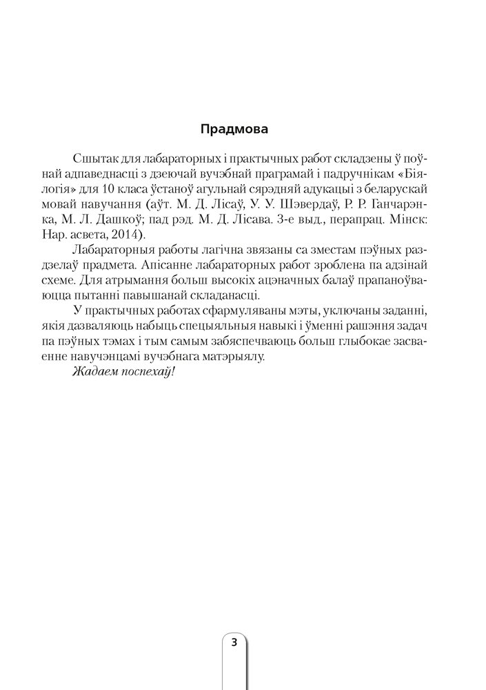 Дапаможнік падрыхтаваны ў поўнай адпаведнасці з вучэбнай праграмай і вучэбным дапаможнікам «Біялогія» для 10 класа ўстаноў агульнай сярэдняй адукацыі з беларускай мовай навучання (пад рэдакцыяй М. Д. Лісава).