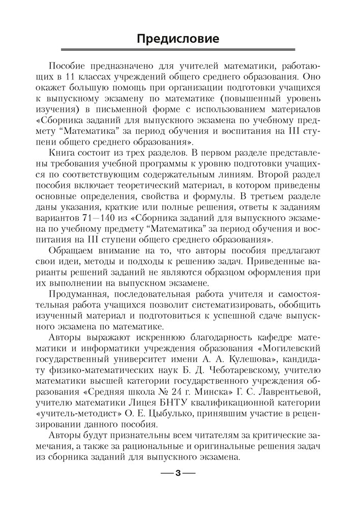 Издание содержит указания, решения и ответы к заданиям из книги "Сборник заданий для выпускного экзамена по учебному предмету "Математика" за период обучения и воспитания на III ступени общего среднего образования", требования учебной программы к уровню подготовки учащихся, краткий теоретический материал. Предназначается для подготовки к выпускному экзамену по математике на повышенном уровне.