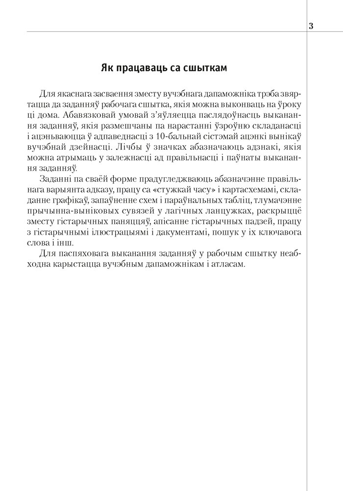 Рабочы сшытак з’яўляецца часткай вучэбнаметадычнага комплексу па гісторыі Беларусі для 10 класа і падрыхтаваны ў адпаведнасці з вучэбнай праграмай і вучэбным дапаможнікам. Выданне змяшчае заданні рознага ўзроўню складанасці, якія накіраваны на засваенне вучнямі тэарэтычных, факталагічных, храналагічных, картаграфічных вучэбных гістарычных ведаў. Адрасуецца вучням 10 класа ўстаноў агульнай сярэдняй адукацыі.