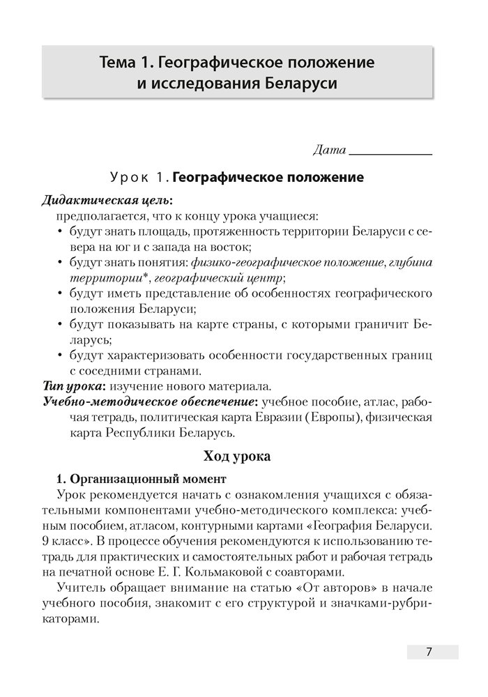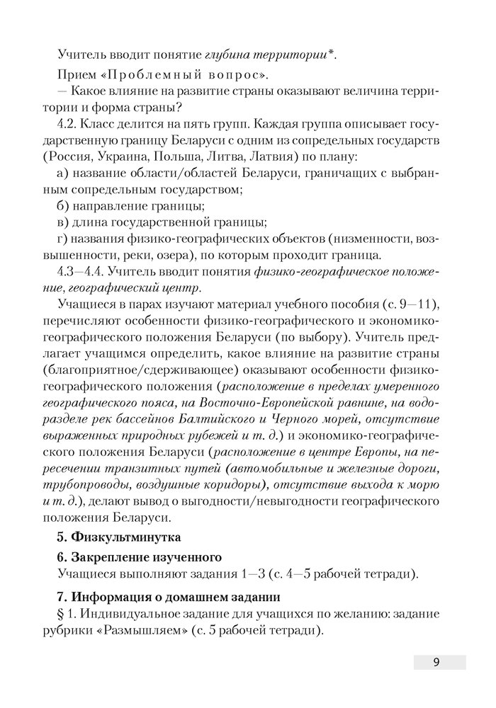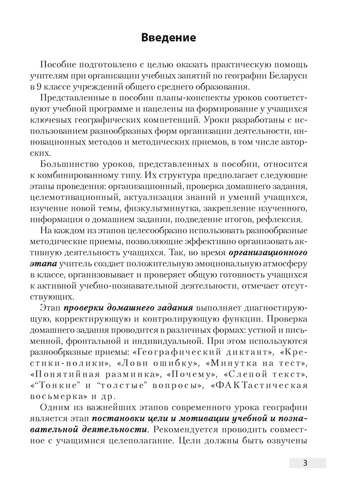 Пособие окажет практическую помощь учителям при организации учебных занятий по географии Беларуси в 9 классе учреждений общего среднего образования. Представленные в пособии планы-конспекты уроков соответствуют учебной программе и нацелены на формирование у учащихся ключевых географических компетенций. Уроки разработаны с использованием разнообразных форм организации деятельности, инновационных методов и методических приемов в рамках реализации компетентностного подхода.