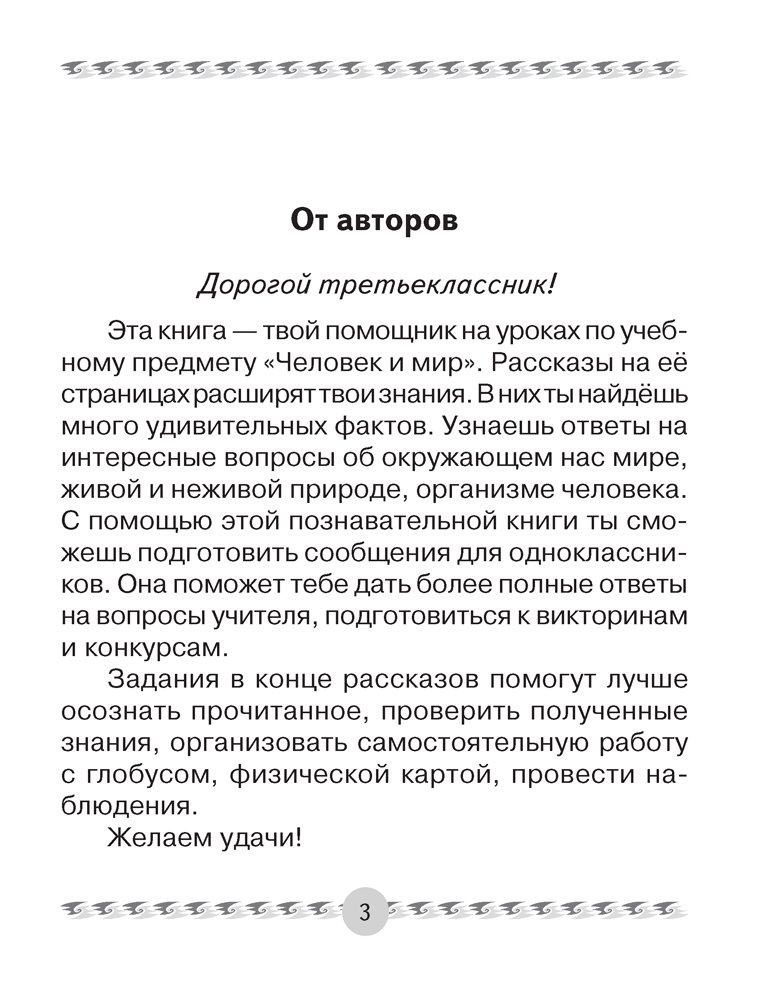 Книга соответствует учебной программе для 3 класса и включает тексты для совместного чтения взрослых и детей. Развивающий характер материалов пособия будет способствовать расширению знаний учащихся по учебному предмету «Человек и мир».